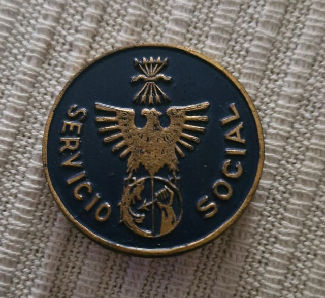 Insignia del Servicio Social de la Falange Española. - Diseño circular con águila y yugo. - Inscripción SERVICIO SOCIAL en el borde.