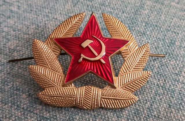 Detalles del productoPreciosa insignia soviética con una estrella roja y hoz y martillo, rodeados por hojas de laurel. Está en muy buen estado.