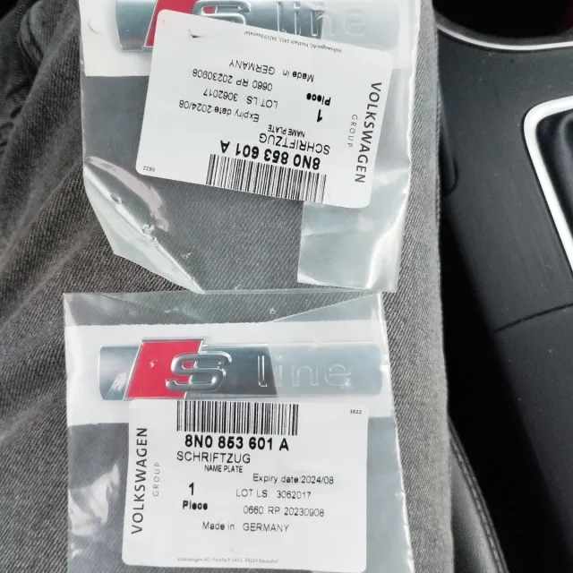 Juego de insignias originales para laterales de Audi S line. Fabricadas en Alemania. - Referencia: 8NO 853 601 A - Lote: 3062017 - Fecha de caducidad: 2024/08