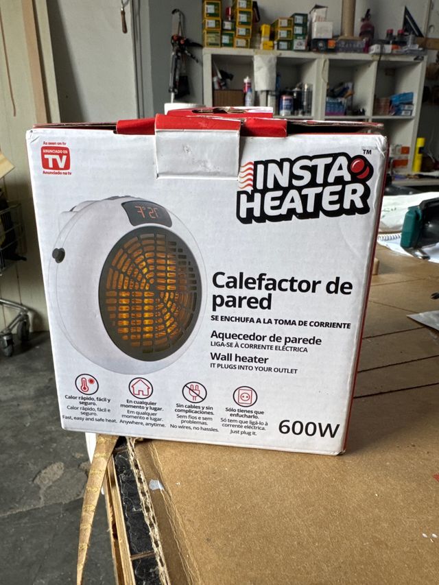Calefactor de pared Insta Heater de 600W. Es compacto y fácil de usar.