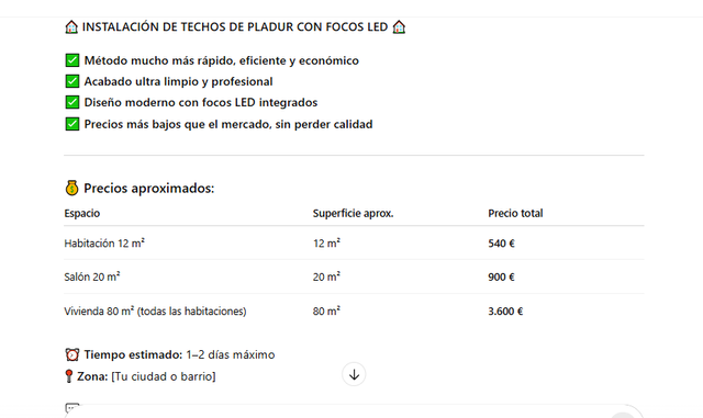 Detalles del productoInstalacion de techos de pladur a peticion del cliente, con focos led, usando metodo de facil y rapido montaje con o sin aislante acustico // termico, el metodo con perfiles omega permite un facil y rapido montaje y acabado con una capa de aisalante acustico directa y sin huecos ni recortes, esto le de a la vivienda una mejor iluminacion estrategica y un control mayor de las zonas. Sobre precio aparece algo en las fotos, pero pedir presupuesto sin compromiso, Un saludo.