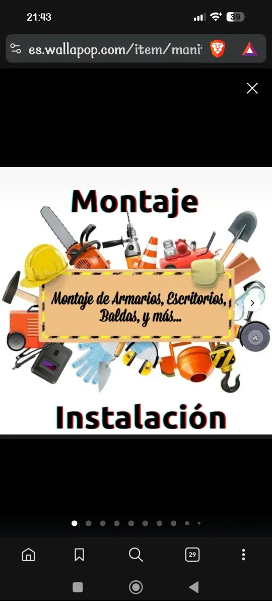 Detalles del productoProfesional con herramientas como sensor de tuberias y nivel laser, realiza montaje de CAMAS, ARMARIOS, ESCRITORIOS, Y CÓMODAS de IKEA, Leroy Merlin, Maison Du Monde, y otras.¡A tan solo 20 euros la hora! También Cabeceras, VITROCERÁMICA, Hornos eléctricos, Espejos, Cuadros, Baldas, muebles de baño, Estores, ventiladores de techo y lámparas. "ÚNICAMENTE INSTALACIÓN DE LOS ARTÍCULOS DETALLADOS". Abstenerse de contactar para otros servicios.