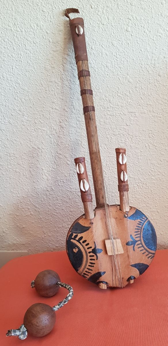 Detalles del producto-Kora: de cuerda con calabaza, madera tallada, caoris y piel pintada.