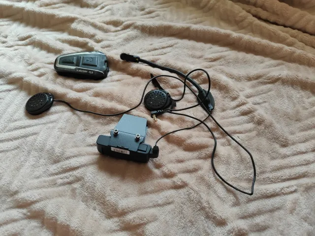 Sistema de comunicación para casco de moto Scala Rider Q3. - Unidad principal. - Auriculares. - Micrófono. - Soporte de montaje.