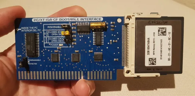 Interface para ordenador XT ó PC de los 80s/90s QUE TENGA PUERTO ISA. Con esto puedes arrancar el PC desde la TARJETA CF INCLUIDA de 1Gb con FREEWARE y tener facil acceso a intercambiar datos con él. En algunos como p.ej Sinclair PC200 es la única forma de tener "disco duro", se comporta como tal y arranca como C: en MSDOS. Se puede usar en vez de la CF un adaptador CF a SD (aparte). Perfil bajo para ocupar menos sitio, led de acceso propio y de power, BIOS propia version 2024, puerto I/O y direccion seleccionable, NO necesita driver! CONSULTAME DUDAS si tienes IBM. Probado Amstrad PC1512, 1640, 286 pc200 ETC