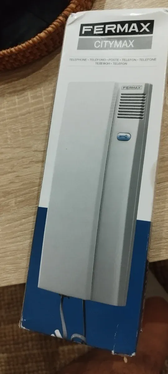 Detalles del productoInterfono de la marca Fermax, modelo Citymax. Su diseño es alargado y de color gris claro, con un discreto botón azul en la parte frontal.