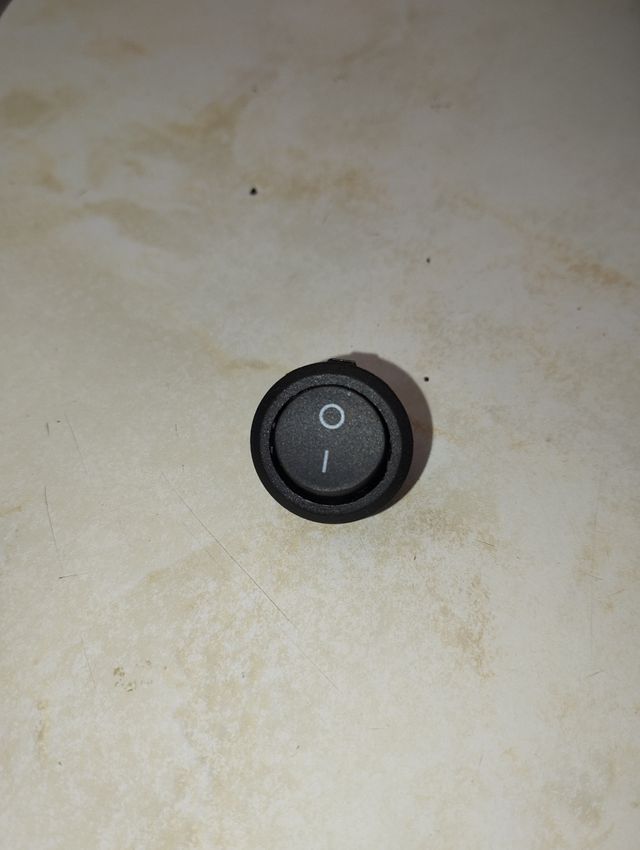 Interruptor pulsador circular de color negro. - Es un interruptor de encendido/apagado. - Tiene un diseño compacto y sencillo. - Ideal para proyectos electrónicos.