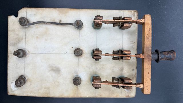 Detalles del productoInterruptor antiguo montado sobre una base de mármol de lápida. Pieza única con un diseño industrial. 27x16 cms