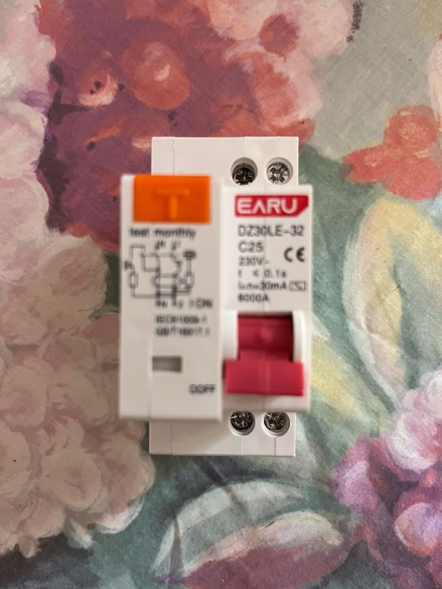 Interruptor diferencial de la marca EARU, modelo DZ30LE-32. - Capacidad: 25A. - Tensión: 230V~. - Corriente residual: 30mA. - Poder de corte: 6000A.