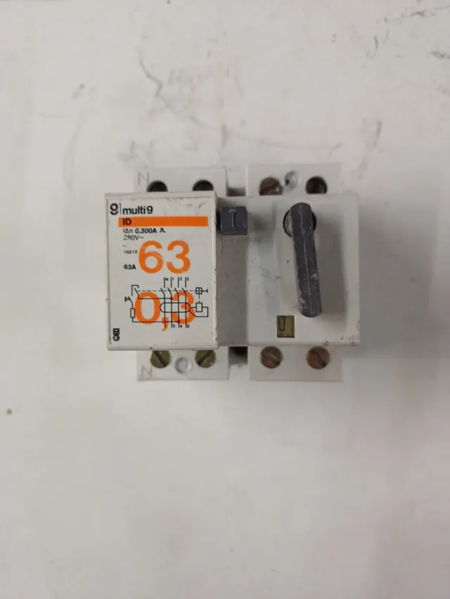 Interruptor diferencial de la marca Multi9, modelo ID. - Intensidad nominal: 63A. - Corriente residual: 0,300A. - Tensión nominal: 240V~.