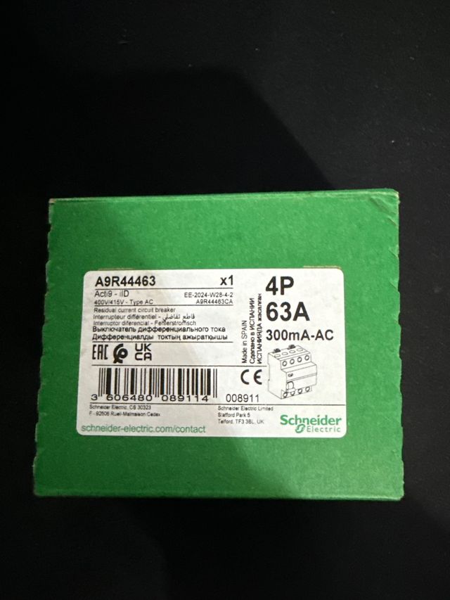 Interruptor diferencial Schneider Acti9. - Modelo: A9R44463 - Tipo: 4P - Intensidad: 63A - Sensibilidad: 300mA-AC - Tensión: 400V/415V - Fabricado en España