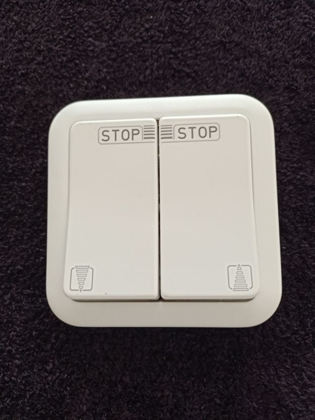 Interruptor doble para persianas, de color blanco. - Dos botones con la palabra STOP grabada. - Símbolo de persiana en cada botón.