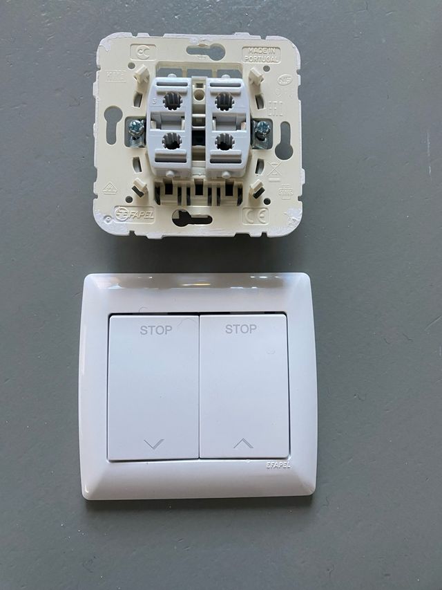 Detalles del productoInterruptor doble de la marca EFAPEL, diseñado para persianas motorizadas. El mecanismo es de color blanco y cuenta con dos botones.