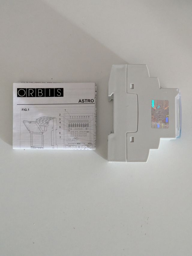 Detalles del productoInterruptor horario astronómico Orbis Astro Uno NFC Bluetooth. Totalmente nuevo, nunca fue instalado. Ideal para programar cualquier aparato, iluminación, etc.