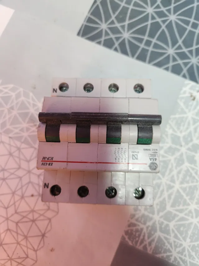 Interruptor magnetotérmico de 40 amperios. - Marca: GE. - Modelo: ICP-M EB 63N. - Tensión nominal: 400V.