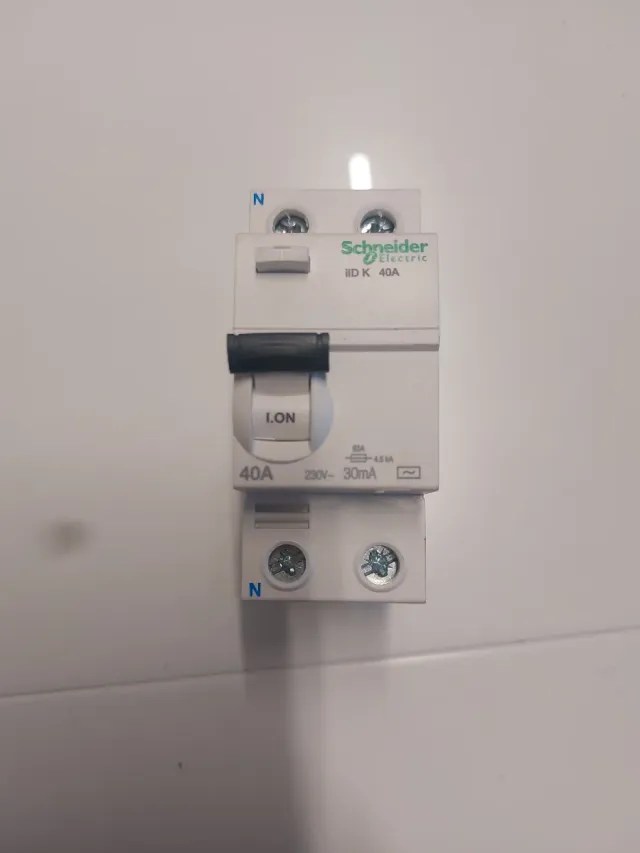 Interruptor automático de la marca Schneider Electric. - Modelo: IID K 40A. - Capacidad: 40A. - Tensión: 230V~. - Sensibilidad: 30mA.