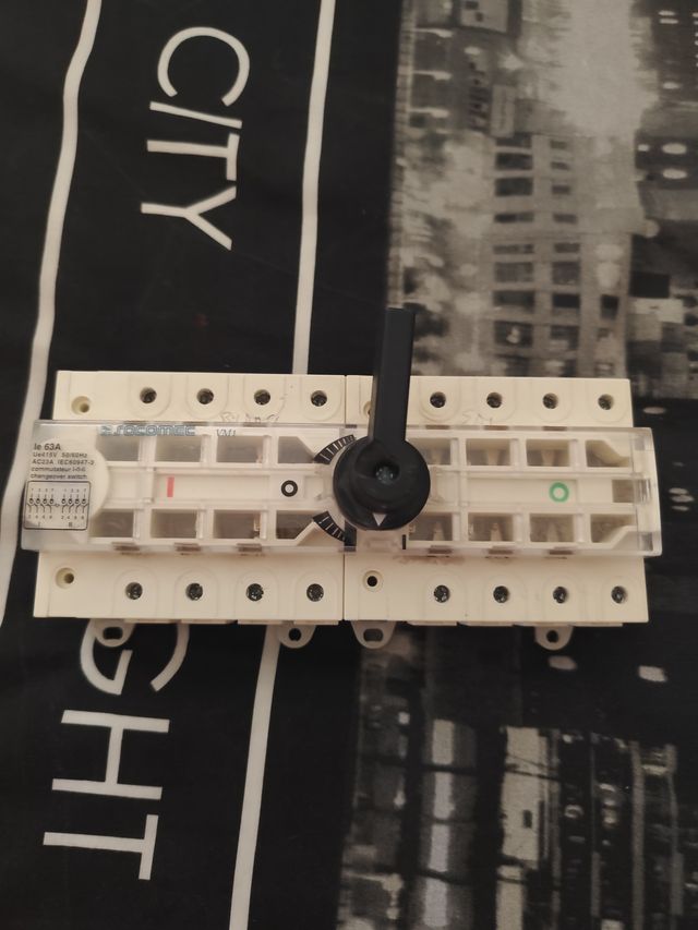 Interruptor de cambio SOCOMEC. - Corriente nominal: 63A. - Voltaje: 415V 50/60Hz. - Clasificación: AC23A IEC60947-3. - Tipo: Conmutador I-0-II.