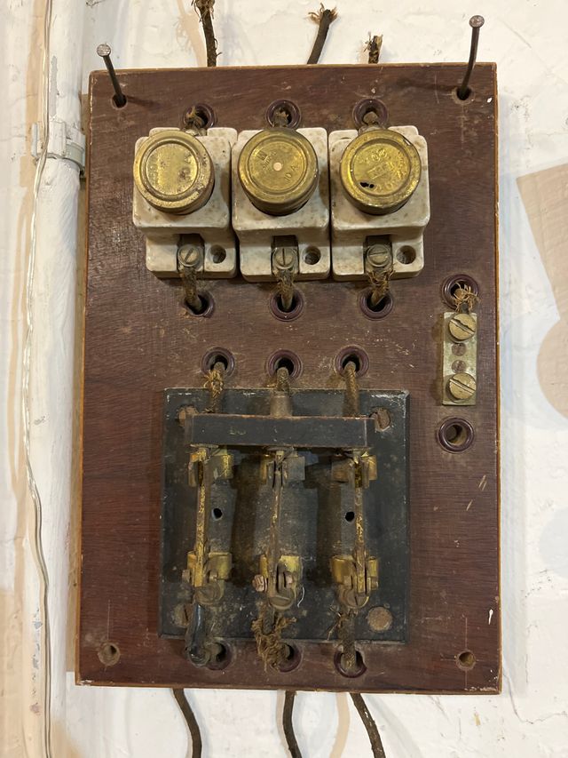 Interruptor trifásico antiguo montado sobre base de madera. - Tres fusibles de cerámica y latón. - Mecanismo de palanca metálico.