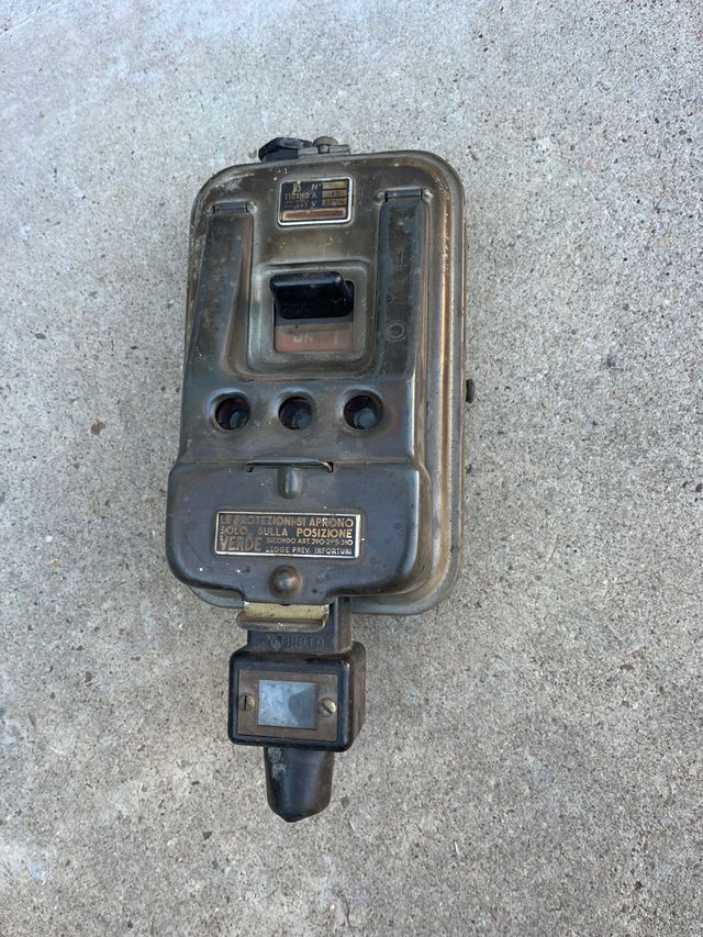 Detalles del productoInterruptor trifásico vintage de la marca Ticino. Presenta inscripciones en italiano.