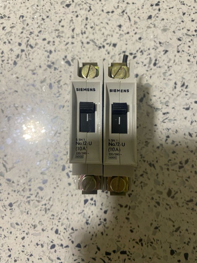Dos interruptores automáticos de la marca Siemens. - Modelo: 5 SN 1 No.12-U - Capacidad: 10A - Voltaje: 220/380V - Capacidad de ruptura: 6000