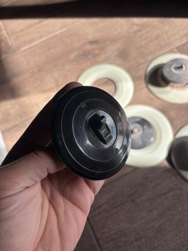Detalles del productoConjunto de interruptores antiguos de baquelita, ideales para proyectos de restauración o decoración retro.