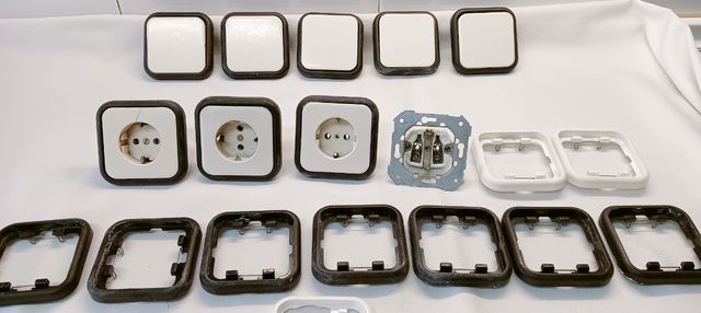 Lote de interruptores y enchufes de diferentes tipos. - Varios interruptores de luz. - Varios enchufes. - Componentes de montaje.