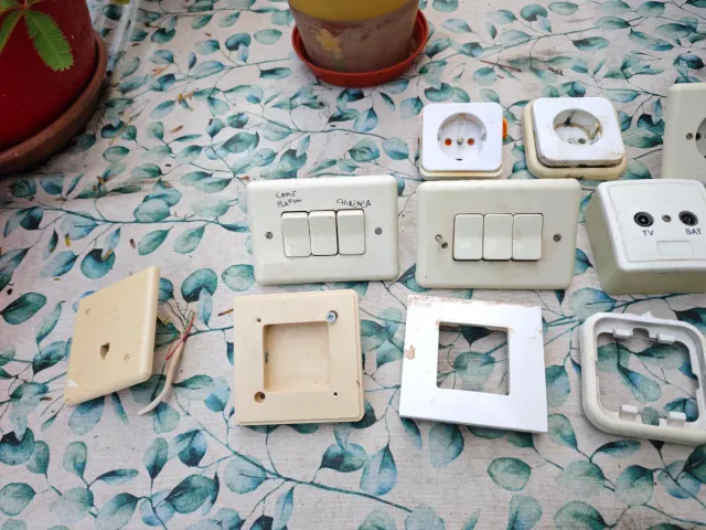 Detalles del productoLote de interruptores y enchufes de estilo vintage, ideales para proyectos de restauración o decoración retro. Piezas de diferentes modelos y acabados.