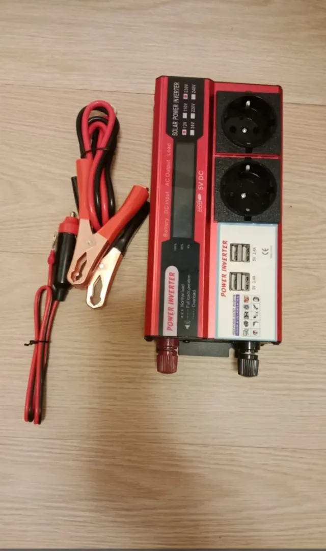 Inversor de corriente de 800W con pantalla LED. - Convierte CC 12V a CA 230V. - Incluye 4 puertos USB. - Diseño compacto y portátil.