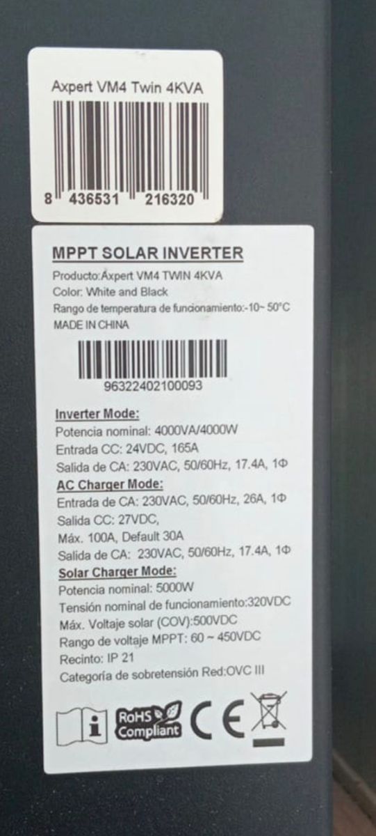 Detalles del productoInversor solar MPPT Axpert VM4 Twin 4KVA.