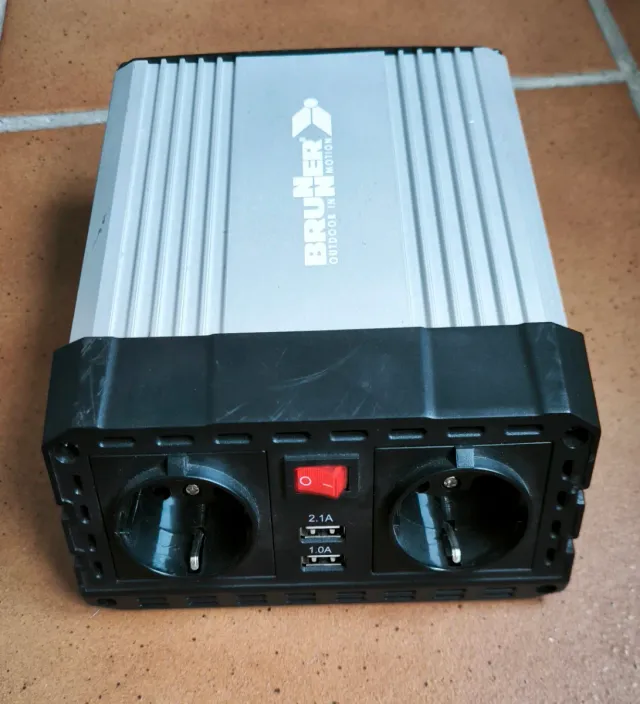 Detalles del productoInversor de corriente Brunner de 300W con dos enchufes y puertos USB.