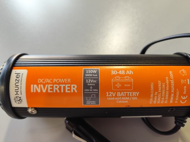 Detalles del productoInversor de corriente con toma para coche, 150W, con pico de 300W para convertir corriente continua de 12V (batería) en corriente alterna de 230V. Para aparatos domésticos en lugares sin red o para cargar dispositivos USB como moviles u ordenadores portátiles. Medidas del producto