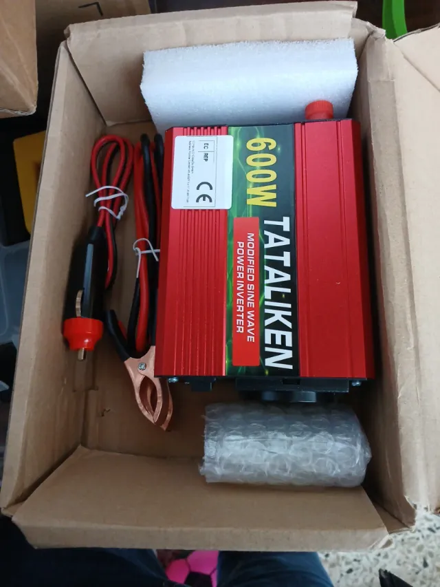 Inversor de corriente Tataliken de 600W. - Diseño en color rojo. - Incluye cables con pinzas y conector para mechero.