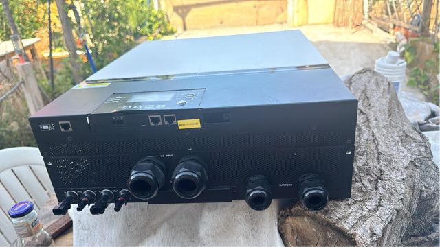 Inversor híbrido solar de 8kW, que convierte corriente continua (48V DC) a alterna (230V AC). Ideal para viviendas. - Convierte 48V DC a 230V AC. - Potencia de 8kW. - Diseño robusto y compacto. - Incluye conexiones para paneles solares y baterías.