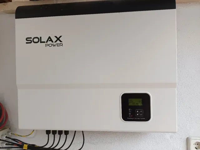 Inversor de energía solar marca Solax, modelo SK-SU5000E. - Color blanco. - Pantalla digital. - Conexiones inferiores.