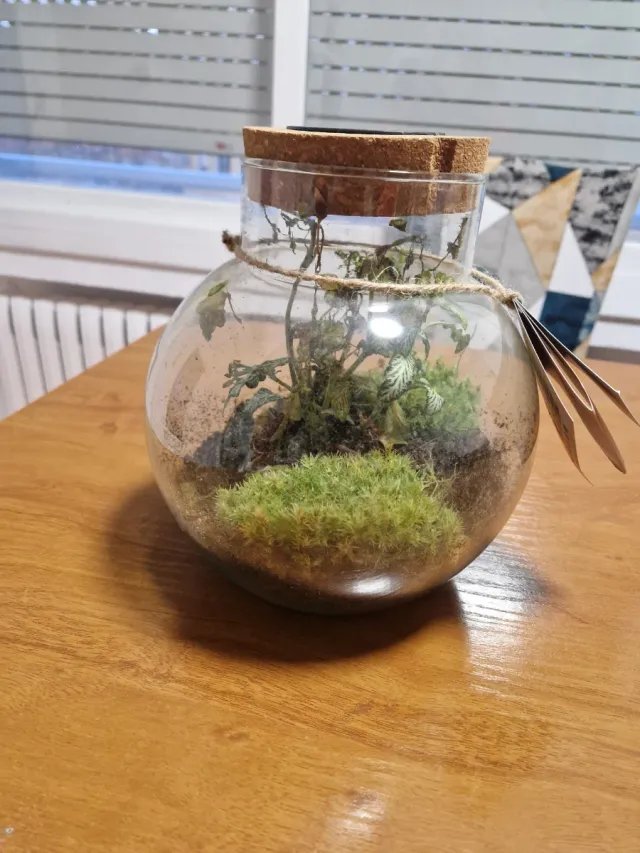 Pequeño ecosistema en un frasco de cristal con plantas y musgo. Puedes empezar de cero creandolo tu mismo o mantener el que ya tiene. - Ideal para decoración. - Cierre con corcho. - Atado con cuerda.