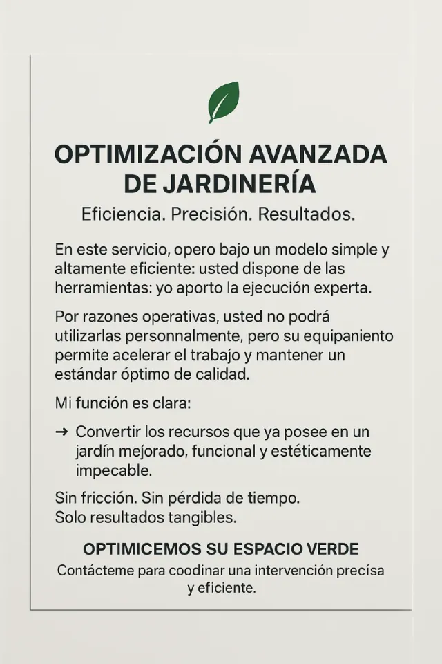 Ofrezco servicio profesional de jardinería para mantenimiento, limpieza, poda y optimización de espacios verdes. Actualmente no dispongo de herramientas propias, pero si tú las tienes, puedo utilizarlas sin problema para realizar el trabajo con eficiencia y buenos resultados. Ideal para quienes no pueden o no desean usar sus herramientas, pero quieren un jardín cuidado, limpio y bien presentado. Trabajo con seriedad, puntualidad y atención al