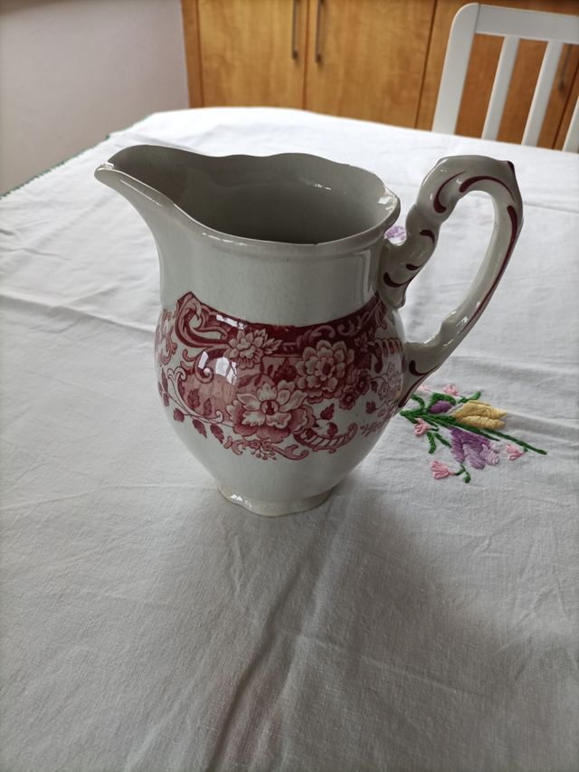 Detalles del productoPreciosa jarra antigua de La Cartuja, con un diseño floral en tonos rojizos sobre fondo blanco, modelo 202. Se encuentra en buen estado, lista para decorar tu hogar o para uso diario.