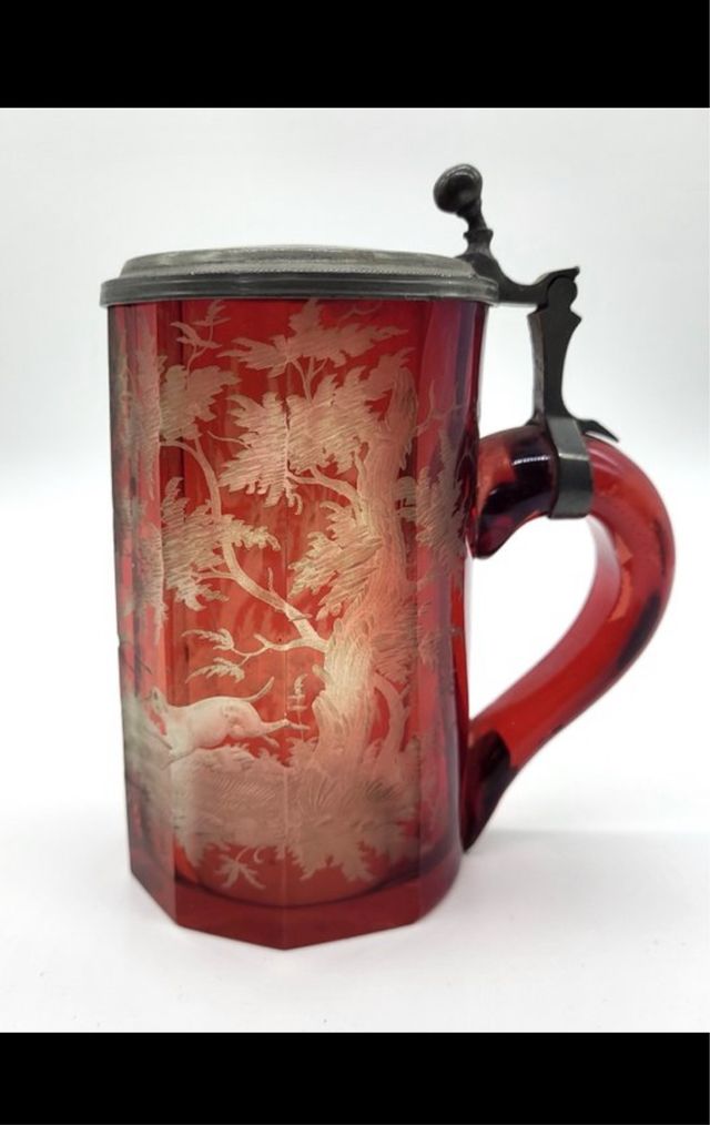 Detalles del productoAntigua jarra de cerveza en Cristal de Bohemia rojo rubí con escena de caza finamente grabada y paisaje. Tapa con iniciales de propiedad y montura de estaño. Buen estado con señales de uso y del paso del tiempo (señalar un pelo en la tapa). Pieza de colección. Medidas: 15,5 cm de alto.