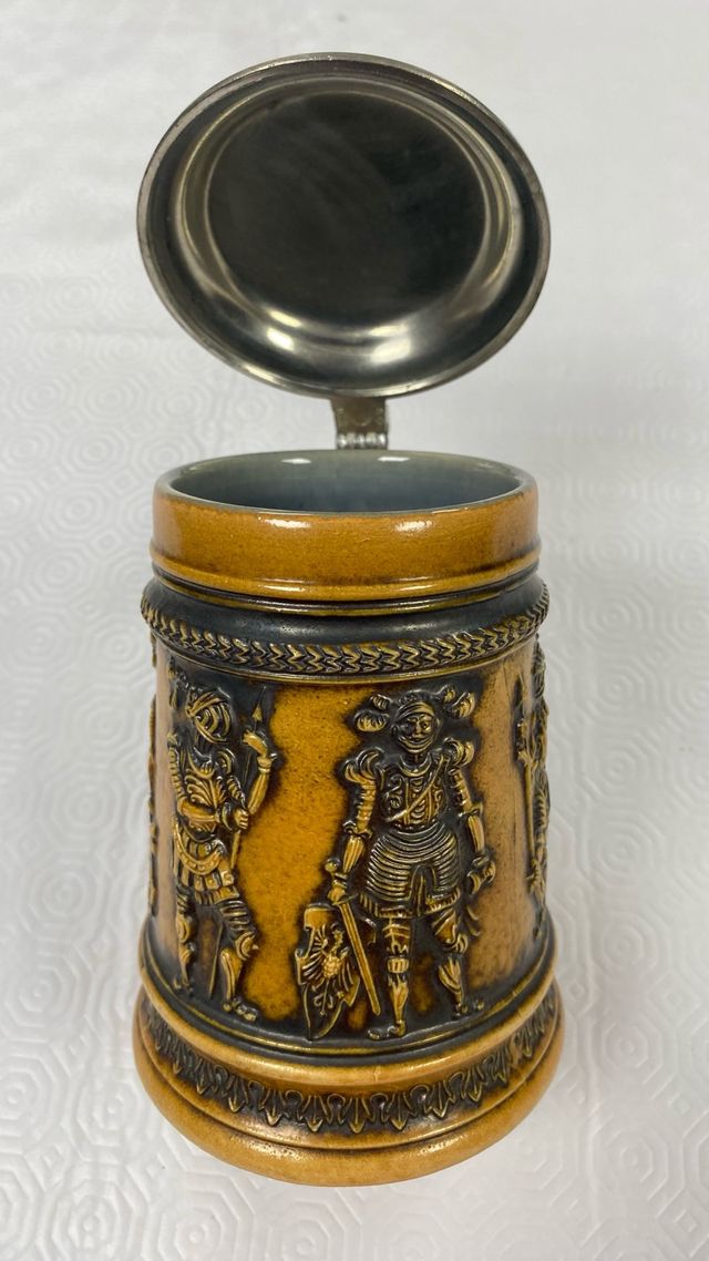 Jarra de cerveza de cerámica con un diseño en relieve de figuras. - Tapa metálica. - Diseño con figuras de caballeros. - Color marrón y detalles en negro.