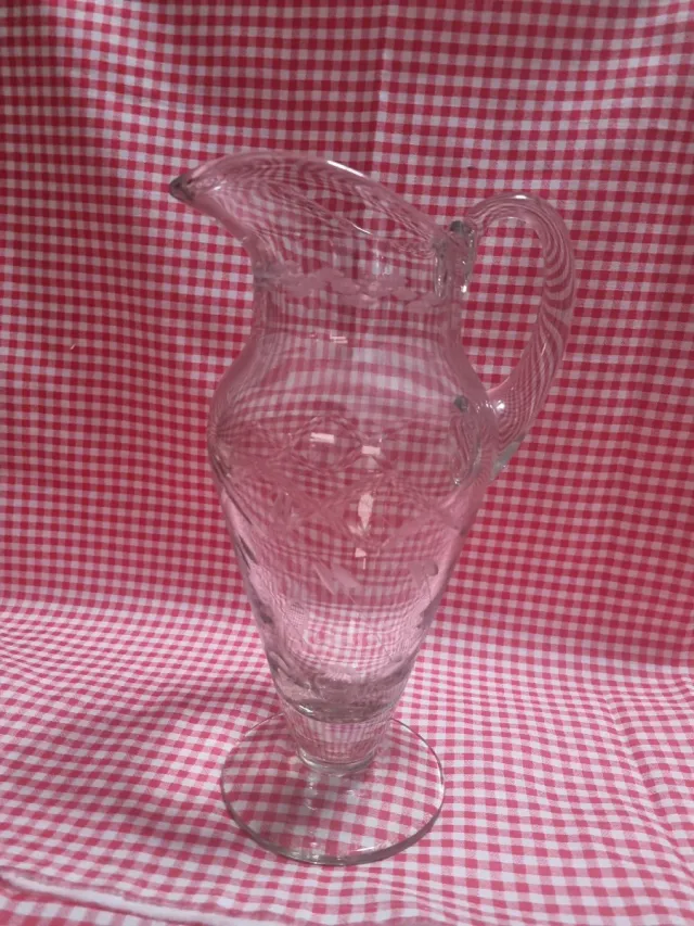 Detalles del productoElegante jarra de cristal antigua con grabados decorativos. Su diseño clásico la hace una pieza única.