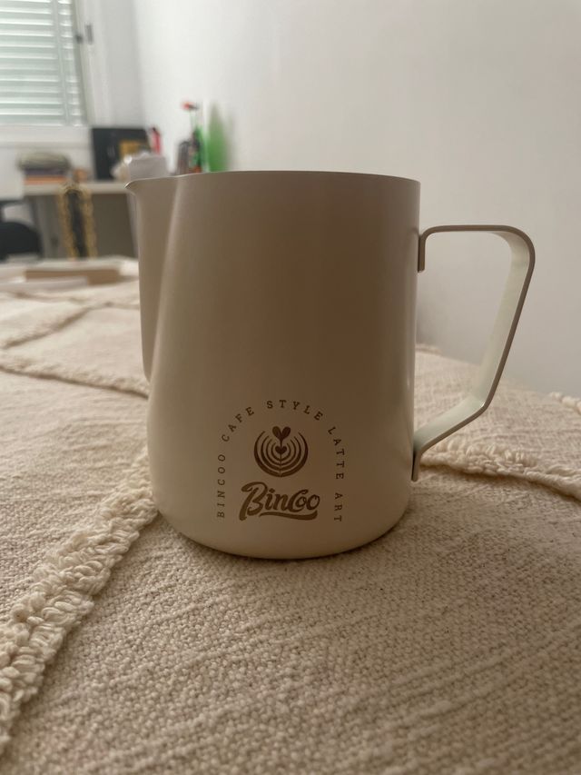 Detalles del productoPreciosa jarra para espumar leche de color crema de la marca Binbo. Ideal para crear latte art. No se ha usado nunca. Capacidad de 600ml.