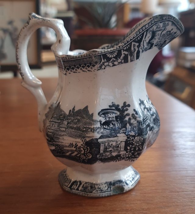 Jarra de loza antigua de Sargadelos, una joya del patrimonio cerámico español. Identificada por su marca en la base y el característico diseño, esta pieza pertenece a la Cuarta Época de la Real Fábrica de Sargadelos (entre 1870 y 1875), un periodo corto que marca el final de la actividad de la fábrica original. 2024-DEC0541