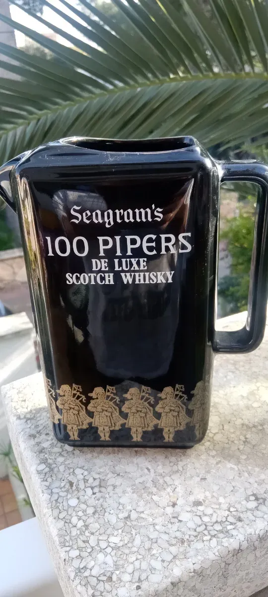 Detalles del productoJarra de cerámica negra conmemorativa de Seagram's 100 Pipers.