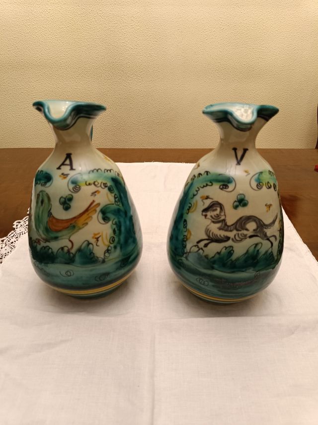 Detalles del producto2 Jarras para de cerámica de Talavera para Agua y Vino. Marcadas las iniciales A y V.