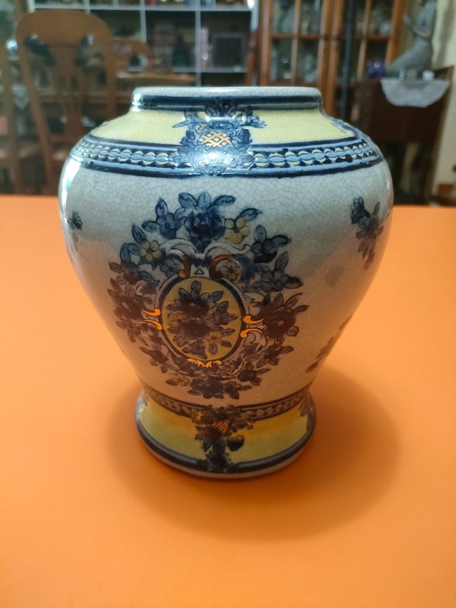 Jarrón de cerámica con un diseño floral azul y amarillo. - Estilo japonés. - Fabricado en cerámica. - Data de los años 60. Alto 19 cm, ancho 16 cm, peso 949g