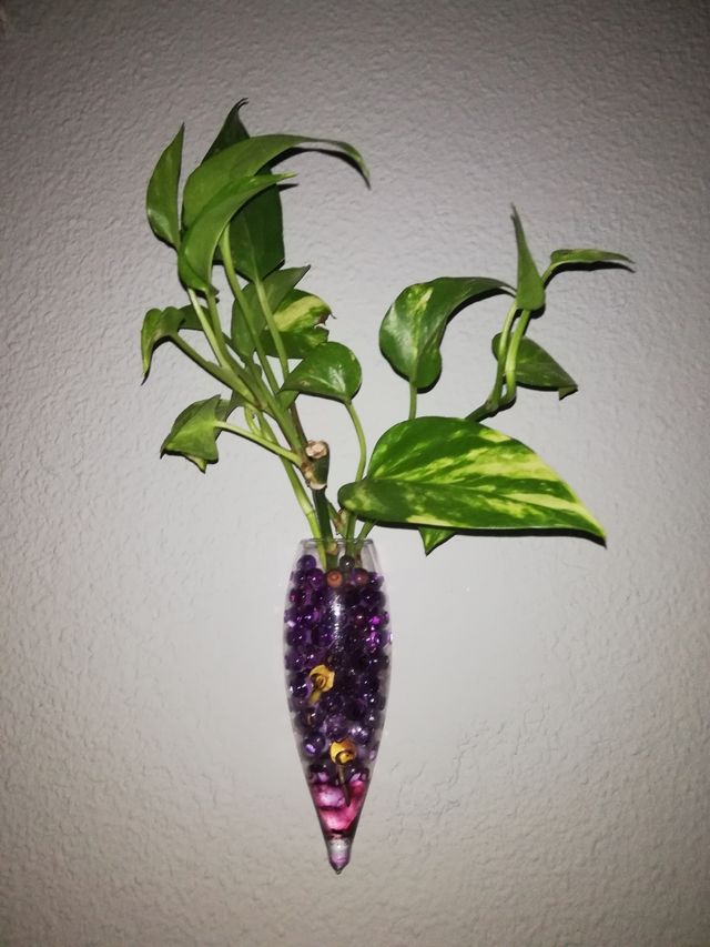Detalles del productoJarrón de vidrio colgante, mide 15x5 cm, se vende tal como esta en la foto con esquejes de poto con raíces Medidas del producto
