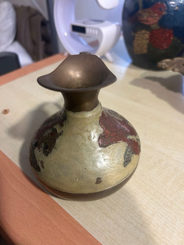 Este jarrón presenta un diseño único con detalles pintados. - Base redonda. - Acabado metálico en la parte superior. - Motivos florales en tonos rojos y ocres.