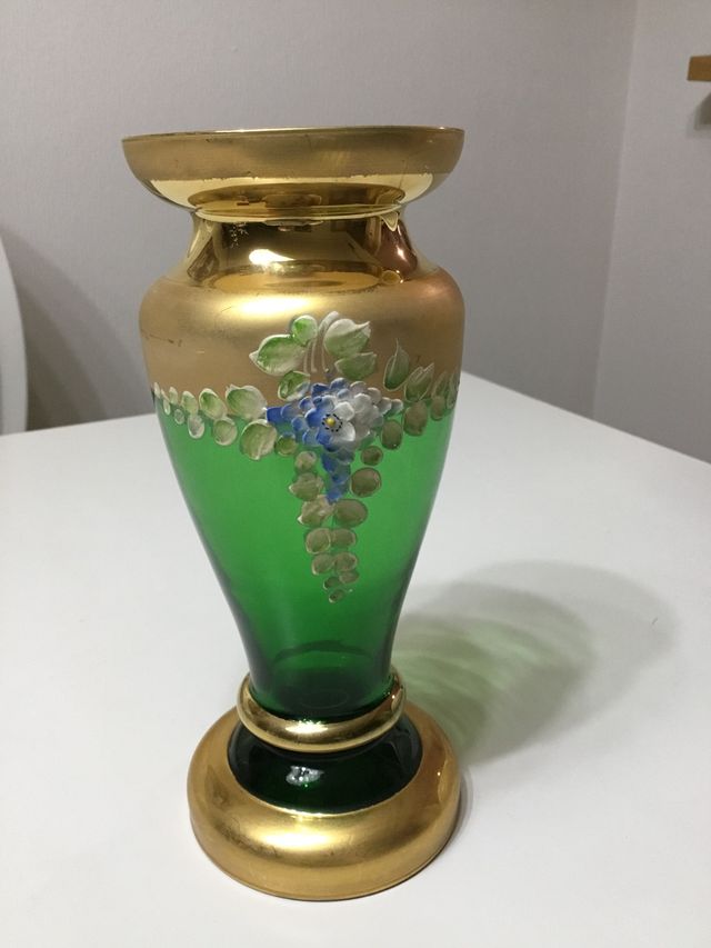Detalles del productoElegante jarrón vintage de finales de los años 60. Su diseño combina el verde vibrante del cristal con detalles dorados.