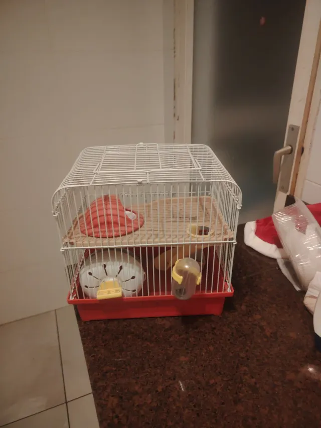 Detalles del productoJaula de dos pisos para hámster con accesorios incluidos. La base es de plástico rojo y la estructura de alambre blanco.
