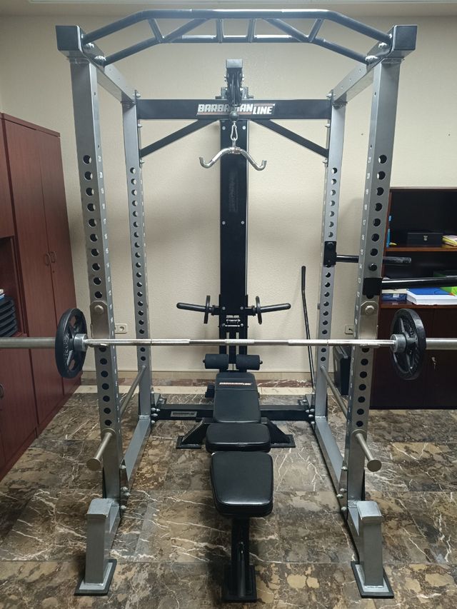 Detalles del productoVendo jaula de potencia multifunción profesional de la marca Barbarian Line con banco incluido + agarre curl, agarre triceps, agarre espalda, set de poleas altas y bajas y set de pesas de hierro compuesto por 2x20+2x15+2x10+4x5+4x2,5+4x1,25